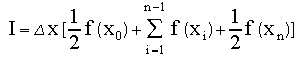 | Integration of functions is a common task in numerical analysis. In this chaper we look at some basic techniques. As found in your calculus book, the integral of function f(x)       can be approximated by the summation of the areas of slices, or rectangles, beneath the function        where       and  This approximation can certainly be used for numerical integration but it will not provide very accurate values for most functions of interest. The flat top of the rectangle will not match well with curving functions and this error will accumulate for practical values for n. As n increases, eventually the accumulation of round off errors becomes the dominant error. If we approximate the function over the dx interval with the linear interpolation formula:       then for a fixed           or        This is called the trapezoid rule as the sum is over the areas of trapezoids with sides of heights f(xi) and f(xi+1)and width delx.